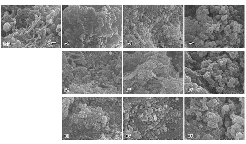 根據(jù)3.1節(jié)中的COD去除率變化選擇具有代表性的濃度組(A組:A2、A4、A6;B組:B2、B4、B6;C組:C1、C3、C5)進行各項指標(biāo)的測定.圖 2為放大10000倍后的顆粒污泥的掃描電鏡圖.由圖 2可見,空白組厭氧顆粒污泥表面幾乎為8~25 μm長的桿狀菌,伴隨有少量的球菌,污泥表面凹凸不平孔隙交錯,是內(nèi)部微生物能量代謝的重要通道.在高濃度的亞硝氮、硝氮和氨氮(A6、B6和C5)作用下,厭氧顆粒污泥的表面結(jié)構(gòu)都發(fā)生明顯變化,污泥表面的主要細菌由桿狀菌變?yōu)榍驙罹瑤缀醪灰姉U菌.低濃度抑制作用下,污泥表面主要細菌為桿菌和球狀菌,且與空白組相比桿菌比例明顯降低.
