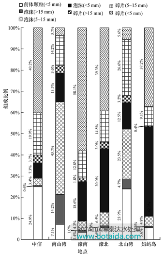 另外,不同尺寸級別的塑料垃圾數(shù)量比例也存在差異(圖 1).除南山灣和北山灣以外,其余4個(gè)沙灘中微型塑料總數(shù)所占比例都較高(高于70%),北山灣和南山灣的塑料垃圾中占比最大的尺寸主要集中在5~15 mm(占比均高于50%),且以泡沫為主.北山灣和中信北部沙灘上的中型塑料碎片(5~15 mm)比例較高,這些都可能成為該地區(qū)后期微型塑料污染的潛在來源.