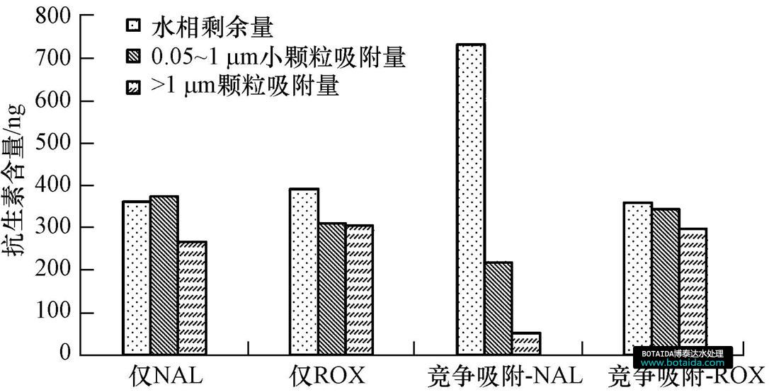 有研究發(fā)現(xiàn),不同粒徑的顆粒物在天然水體中的分布不同,對抗生素的吸附能力也不同.一方面,水體中小顆粒物(粒徑<1 μm)的百分含量較高,加之其廣大的比表面積,會大量吸附水體中殘留的抗生素,然而傳統(tǒng)飲用水處理標準中卻沒有針對小顆粒物去除效果的相關標準;另一方面,粒徑越小,顆粒物越難以去除,其表面吸附的抗生素也會隨之殘留在水體中,對飲用水安全產(chǎn)生影響.基于此,本文進行了天然水體顆粒物對4種典型抗生素(羅紅霉素(ROX)、青霉素G(PG)、甲氧芐啶(TMP)、萘啶酸(NAL))的吸附平衡實驗,研究它們兩兩之間的競爭吸附特征,并分粒徑測定不同大小顆粒物上的抗生素含量,以期對飲用水水質標準和處理工藝的改善提供借鑒.