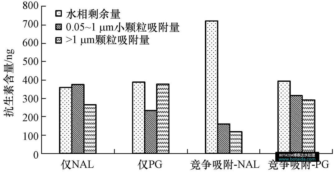 圖 1所示為萘啶酸(NAL)與青霉素G(PG)單獨存在及共同存在于水中的吸附實驗結果.通過對比水相剩余量可知,當萘啶酸和青霉素G同時存在時,固體顆粒對青霉素G的吸附能力大于對萘啶酸的吸附能力.與抗生素單獨存在相比,萘啶酸的水相剩余量顯著增大,而青霉素G的水相剩余量則基本維持不變.可見,青霉素G的存在很大程度地抑制了顆粒對萘啶酸的吸附,但顆粒對其自身的吸附量影響甚微.這同時說明單一物質存在時,即使吸附達到平衡,顆粒上的吸附位點卻未飽和,顆粒的吸附能力并未達到最大.