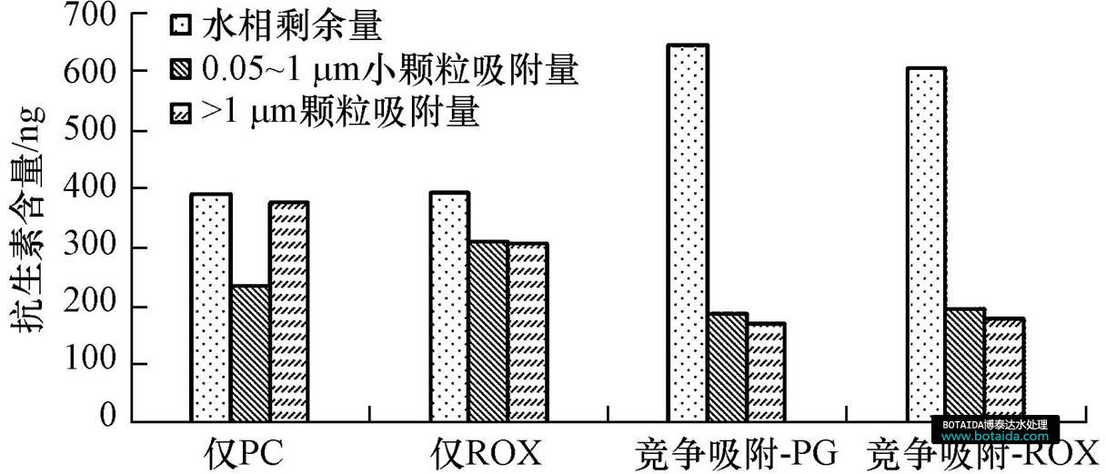 圖 6所示為青霉素G(PG)與羅紅霉素(ROX)單獨存在及共同存在于水中的吸附實驗結果.顆粒上的吸附總量有一定增加,增幅在所有6種競爭吸附中最小,這說明二者同時投加時相互抑制的現(xiàn)象比較明顯.具體到小顆粒的吸附能力及吸附量,二者降幅明顯且羅紅霉素降幅更大,競爭吸附平衡后二者吸附量相當.小顆粒吸附總量由309.20 ng上升至379.48 ng,漲幅為22.8%,依然存在吸附未達飽和的現(xiàn)象.結構上看,二者的活性基團不同,不會造成吸附位點的競爭,而且相互之間不發(fā)生復合反應,不影響抗生素本身的組成,但可能由于羅紅霉素分子量較大,占用空間較大,因此,產(chǎn)生了二者顆粒上的吸附量均減少但總量增多的結果.