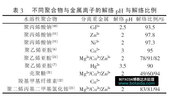 酸化法是將濃縮液的pH 調(diào)低, 破壞聚合物與金屬離子絡(luò)合體,從而釋放出金屬離子?在酸化后,選用恰當(dāng)孔徑的超濾膜將聚合物與金屬離子分離?表3 總結(jié)了不同聚合物與金屬離子的解絡(luò)pH 與解絡(luò)比例?