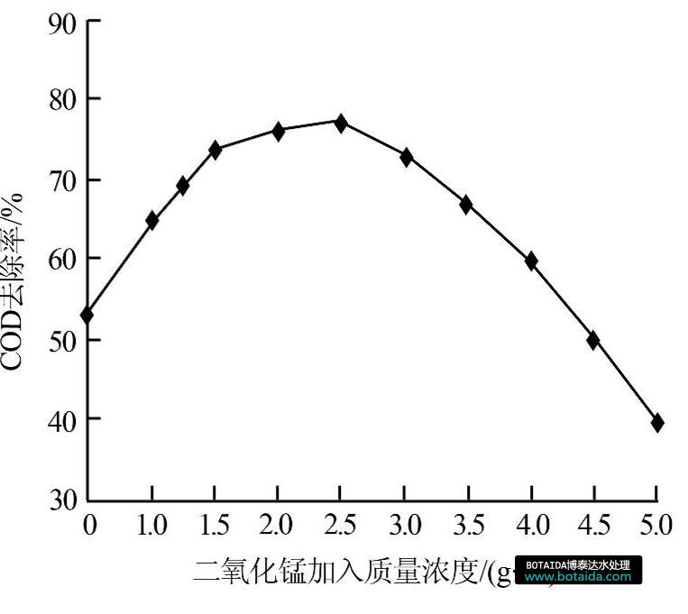 在pH=3.0,鐵炭總質(zhì)量濃度20 g/L,鐵炭比3∶1,反應時間40 min,H2O2投加質(zhì)量濃度為0.55 g/L條件下,分別加入0、1.00、1.25、1.50、2.00、2.50、3.00、3.50、4.00、4.50、5.00 g/L的MnO2,考察二氧化錳對微電解處理廢水體系的催化作用,結(jié)果如圖2所示。