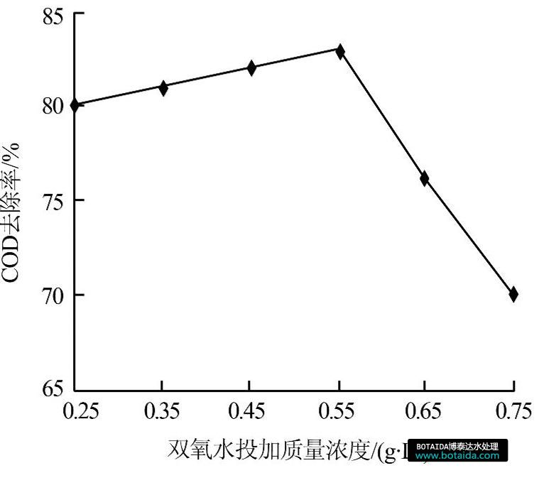 在pH=3.0,鐵炭總質(zhì)量濃度20 g/L,反應時間40 min,MnO2投加質(zhì)量濃度為2.50 g/L,鐵炭比3∶1條件下,分別加入0.25、0.35、0.45、0.55、0.65、0.75 g/L H2O2進行實驗,考察H2O2對微電解處理廢水體系的催化作用,結(jié)果如圖3所示。