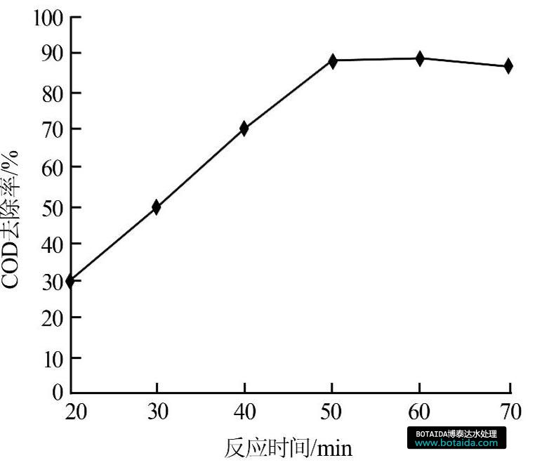 由圖5可知,隨反應時間的增加,COD去除率不斷增加。在反應進行到50 min時,COD去除率最高,達到88%。超過50 min后COD去除率基本不再變化,甚至有所降低。其原因是,反應時間延長可使電極反應的產(chǎn)物與廢水中污染物進行充分的電化學、吸附及絮凝等作用。但是反應時間過長會使更多的Fe2++被氧化成Fe3++,使色度增加,反應時間過長也會導致廢水中沉積物沉積在填料之間的空隙中,覆蓋于鐵和炭表面,阻礙了兩者的接觸,抑制反應的進行。而且反應時間的延長,會使反應器的容積增加、建筑面積增加,基建費用和設備投資費用增加。因此將最佳反應時間定為50 min。