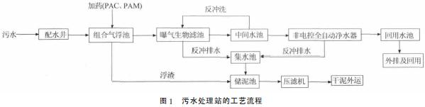 該造紙公司產(chǎn)生污水含有一定量的纖維素、半纖維素、短纖維、滑石粉等,總體來(lái)說(shuō)污染程度較輕。因此選擇物化+生化+吸附工藝,使工程最終處理出水達(dá)到設(shè)計(jì)排放標(biāo)準(zhǔn)要求,工藝流程如圖1 所示。