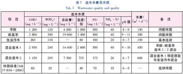廢水來自還原和精制過程,主要分兩部分,其中苯胺進(jìn)水pH 值為8~9,廢水量為150 m3 /d; 硝基苯進(jìn)水pH 值為9~11,廢水量為300 m3 /d; 混合廢水量為450 m3 /d,COD 約為3 000 mg /L,含鹽量高,色度較高,氨氮含量高,是一種濃度高、成分復(fù)雜、難降解的有機(jī)化工廢水。