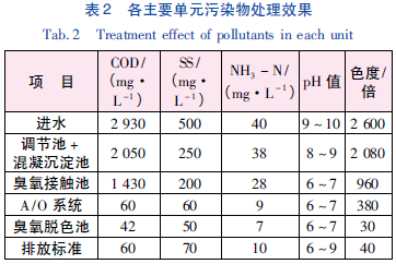 本工程經(jīng)過近2 個月的調(diào)試運(yùn)行后,出水水質(zhì)穩(wěn)定,COD 總?cè)コ蕿?8.6%,達(dá)到設(shè)計(jì)要求。各單元的處理效果見表2。