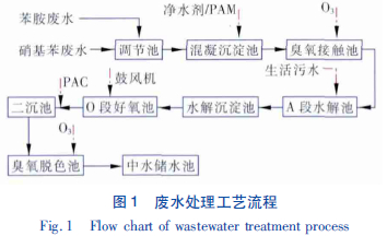 苯胺、硝基苯綜合廢水中含有大量難降解有機(jī)物,COD 值較高,可生化性極差(一般B /C 值為0 ~0.1) ,屬于高含鹽廢水,因此綜合考慮多種因素,決定采用物化與生化處理相結(jié)合的工藝。以混凝沉淀和臭氧氧化作為預(yù)處理單元,不會提高廢水的含鹽量,但可以提高廢水的可生化性,使A/O 生物系統(tǒng)處理效率大幅提高; 在末端再進(jìn)行臭氧氧化脫色處理可確保出水色度達(dá)標(biāo)。工藝流程見圖1。