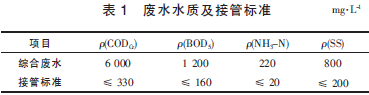 醫(yī)藥中間體生產(chǎn)廢水由工藝廢水和生活污水2部分組成,綜合廢水水質(zhì)指標(biāo)均為平均值,排放標(biāo)準(zhǔn)執(zhí)行當(dāng)?shù)貓@區(qū)污水處理廠的接管標(biāo)準(zhǔn)。廢水水質(zhì)及接管標(biāo)準(zhǔn)見表1。廢水產(chǎn)生量約為260 m3/d,設(shè)計處理量為300 m3/d。