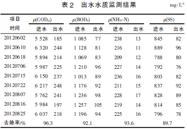 系統(tǒng)經(jīng)過2個月調(diào)試后,各項測試指標(biāo)均達(dá)到污水處理廠的接管標(biāo)準(zhǔn)。運行結(jié)果表明,該系統(tǒng)運行穩(wěn)定,抗沖擊負(fù)荷能力強。環(huán)保部門抽檢及企業(yè)自檢結(jié)果顯示,廢水各項指標(biāo)均穩(wěn)定達(dá)標(biāo)。近期運行數(shù)據(jù)見表2。由表2 可見,廢水經(jīng)過“預(yù)處理-UASB-二級接觸氧化”工藝處理后,平均去除效率分別為CODCr96.3%,BOD5 92.1%,NH3-N 93.6%,SS 89.7%,出水監(jiān)測指標(biāo)均優(yōu)于接管標(biāo)準(zhǔn)。