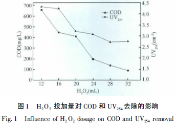 2.1 雙氧水的投加量對(duì)廢水COD 和UV254的影響