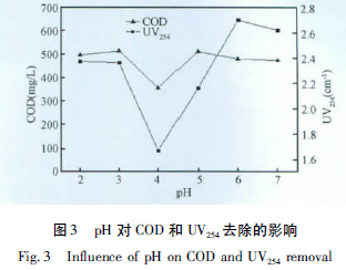 2.3 pH 對(duì)廢水COD 和UV254的影響