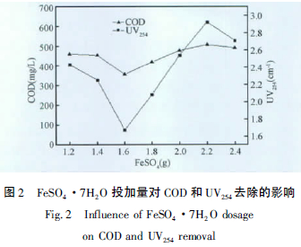 2.2 FeSO4 ·7H2O 的投加量對(duì)廢水COD 和UV254的影響