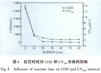 2.4 反應(yīng)時(shí)間對(duì)廢水COD 和UV254的影響