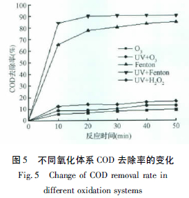 量取300 mL 廢水,調(diào)節(jié)其pH=4 分別采用O3、UV/O3、Fenton(28 mL H2O2、1.6g FeSO4·7H2O) 、UV-Fenton(28 mL H2O2、1.6g FeSO4·7H2O) UV/H2O2(2 mL H2O2) 氧化體系處理廢水50 min,并分別在0、10、20、30、40 和50 min 取樣,中止反應(yīng),測(cè)定處理后廢水的COD,其COD 去除率隨時(shí)間的變化如圖5 所示。