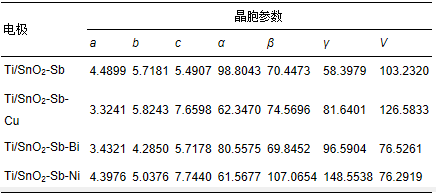 通過XRD分析軟件(X′Pert highscore plus)對數(shù)據(jù)進行分析(晉勇等,2008)得到各電極的晶胞參數(shù)見表 1,分析表中數(shù)據(jù)發(fā)現(xiàn),對Ti/SnO2-Sb電極進行金屬摻雜改性后,晶胞參數(shù)發(fā)生改變,主要體現(xiàn)在晶胞體積的增大或減小,這是由于各金屬離子成鍵半徑不同,當金屬離子以固溶或者類質(zhì)同相的形式取代Sn4+進入SnO2晶格內(nèi)部,必然引起金屬氧鍵的鍵長發(fā)生變化,從而造成晶胞參數(shù)的改變.XRD圖譜和晶胞參數(shù)等數(shù)據(jù)表明,通過金屬摻雜改性使金屬離子進入到SnO2晶格中,其中,Cu和Ni以其p型半導體的性質(zhì)形成了空穴點位(劉淼等,2013),使電極表面形成較為密集的蜂窩狀,微觀結構(圖 1)中也觀察到電極無裂縫且蜂窩狀結構分布均勻,這樣的結構可以增加電極的活性點位而提高電催化性能;而Bi則為n型半導體,與SnO2有著相似的性質(zhì),進入SnO2晶格后主要通過增加自由電子的濃度來達到增強導電能力的效果.