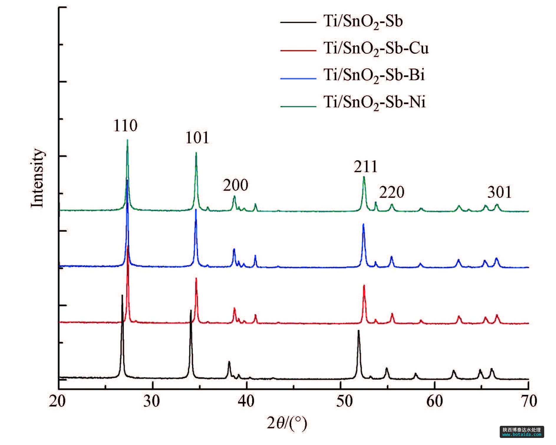 對所制備電極進行XRD分析.從圖 2數(shù)據(jù)可見,所有電極的X衍射峰的位置跟四方形金紅石型的SnO2晶體結構的標準卡片(00-041-1445)的峰數(shù)據(jù)基本一致,并未檢測到Sb及摻雜金屬相應氧化物的衍射峰,表明金屬摻雜并沒有改變SnO2晶體結構.這可能是因為金屬離子進入SnO2的晶格中取代了晶格中Sn4+的部分位置(李子榮和張雪梅,2006),以金屬氧化物的形式固溶到SnO2的晶格中,因而在XRD中Sb及摻雜的金屬沒有以單獨的氧化物形式存在.但是摻雜金屬后電極的X射線衍射峰位置發(fā)生了微小偏移,主要由于金屬離子與被替代的Sn4+之間離子半徑存在差異,以及金屬離子加入后出現(xiàn)的氧空穴而造成晶格缺陷.
