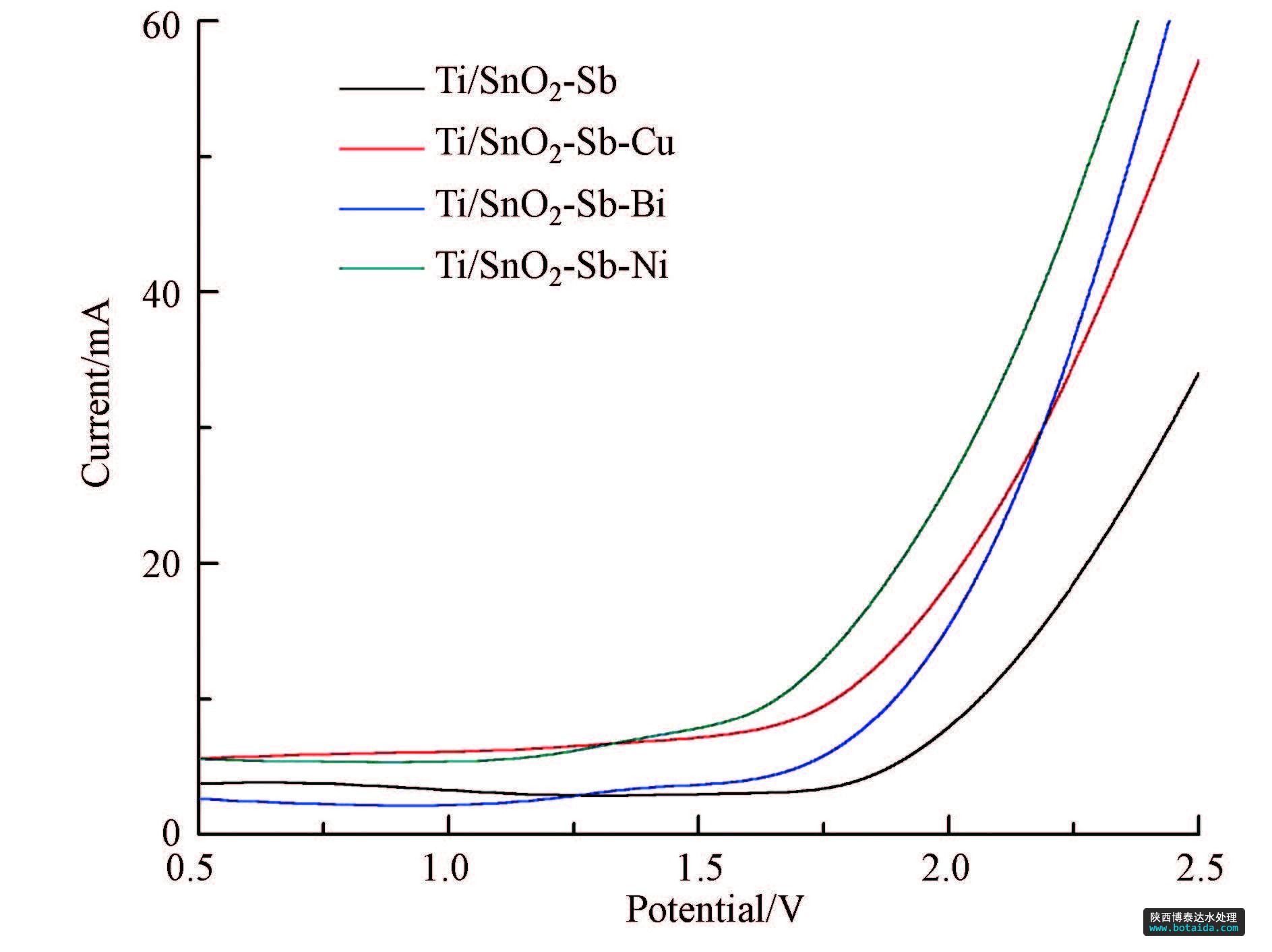 利用CHI 760C電化學工作站測試電極的電化學性能,根據(jù)極化曲線考察摻雜不同金屬對Ti/SnO2-Sb電極析氧電位的影響,用恒電位下的電流-時間曲線反映電極的穩(wěn)定性,以循環(huán)伏安曲線考察電極催化性能.采用三電極體系:制備電極為工作電極、純鈦板為輔助電極、飽和甘汞電極為參比電極,在常溫25 ℃條件下,測定其在0.5 mol · L-1硫酸鈉溶液中的極化曲線,在恒電位(1 V)下測定電流與時間的關系曲線,并在0.5 mol · L-1 Na2SO4溶液和0.5 mol · L-1 Na2SO4+100 mg · L-1 1,4-二氯苯溶液中對改性Ti/SnO2-Sb電極進行循環(huán)伏安測試.
