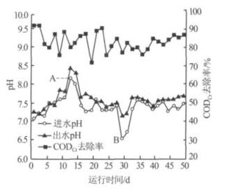 圖 3 進(jìn)、出水 pH 及 CODCr 去除率隨運(yùn)行時(shí)間的變化