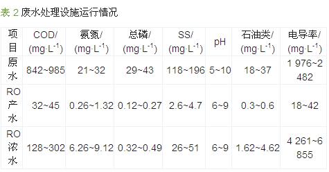 脫脂廢水、磷化廢水、噴漆廢水和電泳廢水等機(jī)械加工廢水的有機(jī)物濃度較高,且含有礦物油、懸浮物和氮磷等污染物。通過氣浮和混凝沉淀處理可將COD降低到700 mg/L左右,生物系統(tǒng)(缺氧和好氧工藝)可將COD降低到70 mg/L左右,出水可穩(wěn)定達(dá)標(biāo)排放。實(shí)際運(yùn)行時首先投加NaOH將廢水pH調(diào)至8.5~9.0,然后按照3、5、1.0 mL/L的投加量分別加入5%(質(zhì)量分?jǐn)?shù),下同)的CaCl2溶液、10%的聚合氯化鋁和5%的聚丙烯酰胺溶液,混合反應(yīng)60 min后進(jìn)入氣浮池,氣浮出水按6、1.5 mL/L投加量分別投加10%的聚合氯化鋁和5%的聚丙烯酰胺溶液,混凝沉淀出水最后進(jìn)入生物處理系統(tǒng),生化出水經(jīng)砂濾器、炭濾器、超濾、保安過濾器和反滲透深度處理后回用于生產(chǎn),反滲透濃水可達(dá)到GB 8978—1996三級標(biāo)準(zhǔn)。該工程已穩(wěn)定運(yùn)行4 a多,從實(shí)際檢測結(jié)果來看,反滲透產(chǎn)水COD穩(wěn)定在32~45 mg/L,電導(dǎo)率穩(wěn)定在18~42 μS/cm,可滿足生產(chǎn)用水水質(zhì)要求;反滲透濃水COD穩(wěn)定在128~302 mg/L,SS穩(wěn)定在26~51 mg/L,達(dá)到GB 8978—1996三級標(biāo)準(zhǔn)后達(dá)標(biāo)排放,其主要水質(zhì)指標(biāo)如表 2所示。