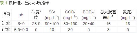 根據(jù)原水來源及出水水質(zhì)要求,確定進、出水水質(zhì)指標見表 1,設(shè)計處理水量為400 m3/d。