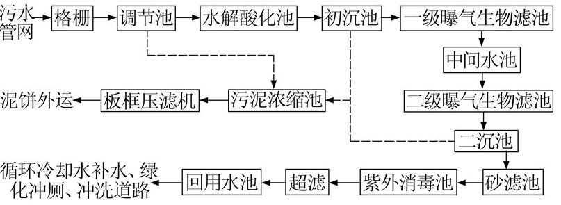 由于污水處理后主要供循環(huán)冷卻水系統(tǒng)補水,對水質(zhì)要求較高。水解酸化工藝可提高污水的可生化性。曝氣生物濾池(BAF)集生物氧化、截留懸浮固體為一體,具有抗沖擊負荷能力強、污泥產(chǎn)量較少、出水水質(zhì)穩(wěn)定等特點〔1, 2〕。超濾在過濾微細懸浮物及膠體物質(zhì)方面具有良好的效果〔3, 4〕,因此采用水解酸化—曝氣生物濾池—超濾組合工藝進行處理,工藝流程如圖 1所示。從流程上分為3個部分: 預(yù)處理工藝、生化處理工藝和深度處理工藝。其中生化處理工藝為水解酸化—兩級曝氣生物濾池工藝,深度處理工藝為超濾工藝。