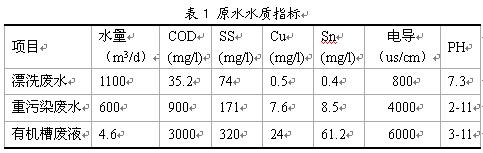 某電子公司是國內(nèi)重點集成電路封裝測試企業(yè),該公司主要從事半導(dǎo)體集成電路、半導(dǎo)體元器件的封裝測試業(yè)務(wù),其生產(chǎn)線廢水主要包括兩部分,一部分為晶元的減薄劃片廢水、另一部分為電鍍錫化廢水。減薄劃片廢水中主要含有大量的硅粉微粒,SS約2000mg/L左右,特性很穩(wěn)定,不易沉降,電導(dǎo)率僅為2-4µs/cm,東洋采用自主研發(fā)的二級連續(xù)UF膜系統(tǒng)進行進行廢水回收利用,廢水回收利用率≥90%,回收水質(zhì)好,同時回收硅粉。在此主要介紹電鍍錫化廢水的回用處理系統(tǒng);廢水中主要含有Cu、Sn、酸堿、有機物等,在該項目中首先要做好分質(zhì)分流是尤為重要,把錫化電鍍線上的廢水按照水中的成份及濃度來分質(zhì)收集,主要分為漂洗廢水、重污染廢水、有機槽廢液三路,水質(zhì)如下:
