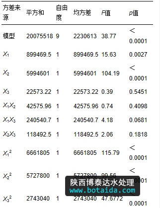 式中,Y為響應(yīng)值;X1、X2、X3為自變量編碼值;B0為常數(shù)項(xiàng);B1、B2、B3為線性系數(shù);B12、B13、B23為交叉項(xiàng)系數(shù);B11、B22、B33為二次項(xiàng)系數(shù);e為誤差. 對(duì)模型進(jìn)行方差分析,并通過模型得到基于微波-過氧化氫-堿預(yù)處理的污泥水解酸化的優(yōu)化工藝條件和最大總VFA濃度.