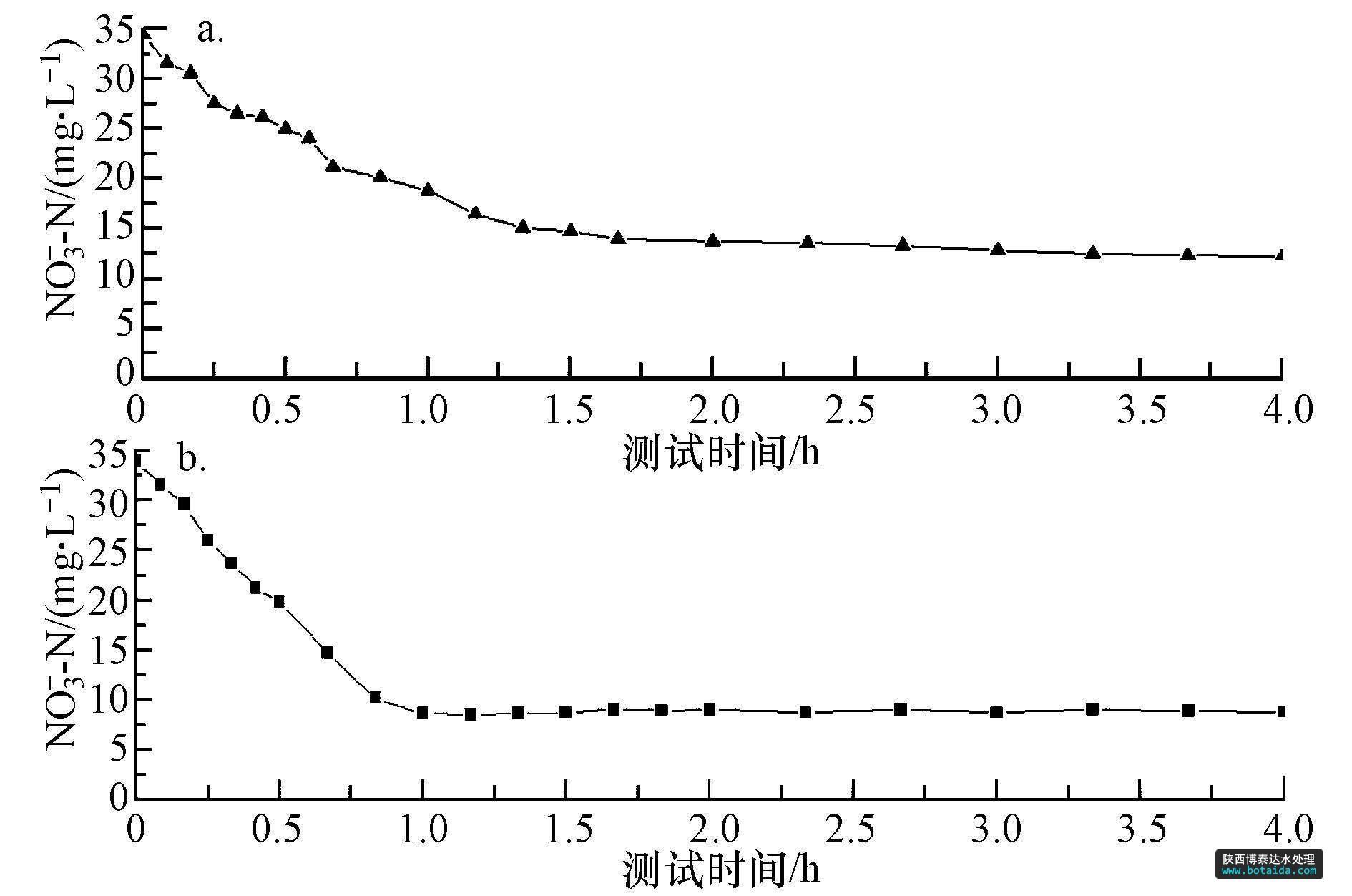 圖5 反硝化測試曲線(a.未優(yōu)化組(僅MW-H2O2-OH預(yù)處理)的污泥上清液(徐榮樂,2014);b.優(yōu)化組(MW-H2O2-OH預(yù)處理并去除殘留H2O2+水解酸化)的污泥上清液)