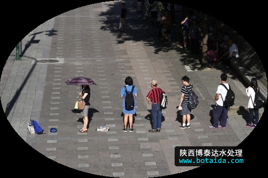 2016年06月01日,臺(tái)北車站附近,等候公共汽車的民眾有的打傘、有的背對(duì)太陽(yáng),有的甚至用背包“排隊(duì)”。