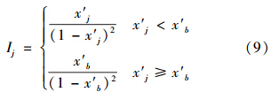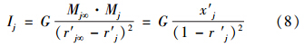 式中,Mj和Mj∞分別為指標j的樣本“規(guī)范質(zhì)量”和“參照級”樣本“規(guī)范質(zhì)量”;r′j為指標j的樣本的“規(guī)范坐標”,顯然r′j=x′j;G為環(huán)境質(zhì)量引力常數(shù),其取值大小只是為了控制指數(shù)Ij的尺度范圍,對評價結(jié)果無任何影響,為簡單起見,在此取G=1.從而式(8)可表示為: