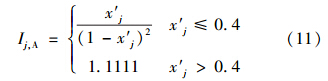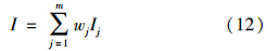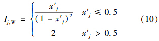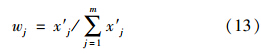 式中,Ij為由式(10)或式(11)計算得到的指標j的引力指數(shù)值;wj為指標j的歸一化權(quán)值,即滿足∑ m j=1 wj=1,它可以視實際問題需要,采用某種方法確定.一般情況下,只要各指標的規(guī)范值x′j差異不大,可視各指標為等權(quán)即可;但若最大指標規(guī)范值x′j,max與最小指標規(guī)范值x′j,min差異較大,則可采用如式(13)所示的對各指標規(guī)范值x′j的線性加權(quán)計算權(quán)值.