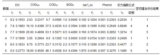 2008年圖們江干流6個斷面的6項地表水水質(zhì)指標監(jiān)測數(shù)據(jù)cj(唐立新等,2010),以及由式(1)和式(2)計算得到的指標規(guī)范值x′j如表 5所示.對斷面2和3,采用式(13)對引力指數(shù)值進行加權(quán)計算;其余斷面在視指標為等權(quán)的情況下,用式(10)和式(12)計算得到各監(jiān)測點水質(zhì)引力綜合指數(shù)值,并根據(jù)表 3中3類陸地水體的引力綜合指數(shù)值的分級標準做出水質(zhì)類別判斷結(jié)果(表 5).表 5中還列出了參考文獻(唐立新等,2010)中用密切值法作出的評價結(jié)果.可以看出,利用引力普適指數(shù)公式和用密切值法對6個斷面水質(zhì)做出的評價結(jié)果,完全一致.