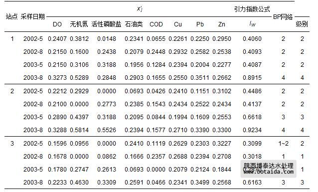 珠江口2002—2003年3個站點8項海水指標監(jiān)測數(shù)據(jù)cj(李占東等,2005)如表 7所示.由式(1)和式(4)計算出的指標規(guī)范值x′j如表 8所示.由于站點1的2003-8和站點2的2002-5,2002-8和2003-5樣本不同指標的規(guī)范值x′j相差較大,因而需用式(13)對引力指數(shù)值進行加權(quán)計算外.其余日期采樣點則視各指標為等權(quán),再用式(10)和式(12)計算得到各站點海水水質(zhì)引力綜合指數(shù)值,并根據(jù)表 3中海水水質(zhì)引力指數(shù)分級標準做出評價結(jié)果(表 8).表中還列出文獻(李占東等,2005)中用BP人工神經(jīng)網(wǎng)絡(luò)評價法做出的評價結(jié)果.可以看出,全部12個樣本2種方法的評價級別完全一致.