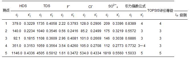 豐縣5個監(jiān)測點的5項地下水指標監(jiān)測數(shù)據(jù)cj(劉洪等,2009),以及由式(1)和式(3)計算得到的指標規(guī)范值x′j如表 6所示.在視各指標為等權(quán)情況下,用式(10)和式(12)計算得到各監(jiān)測點水質(zhì)引力綜合指數(shù)的指數(shù)值,并根據(jù)表 3中3類陸地水體的綜合指數(shù)值分級標準做出水質(zhì)類別判斷結(jié)果(表 6).表中還列出文獻(劉洪等,2009)中用多屬性決策分析法(TOPSIS)做出的評價結(jié)果,可以看出,2種方法做出的評價結(jié)果完全一致.