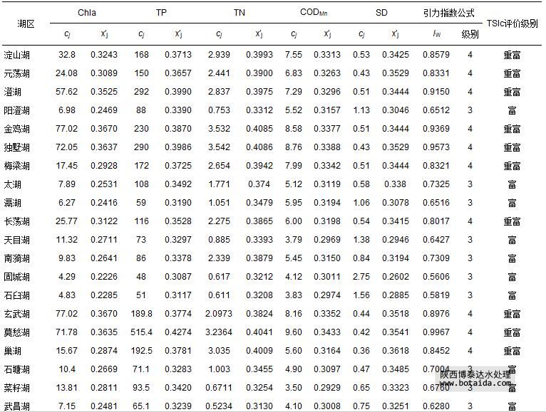 表 9 長江中下游45個湖泊富營養(yǎng)化指標監(jiān)測數(shù)據(jù)cj及其規(guī)范值 x′j和引力指數(shù)公式評價結(jié)果