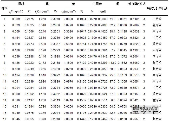 2002年11—12月長春市30個室內(nèi)樣本5項指標監(jiān)測數(shù)據(jù)cj(湯紅巖等,2005),以及由式(1)和式(7)計算出的指標規(guī)范值x′j如表 11所示.由于樣本1、11~15、26和27的不同指標計算得到的規(guī)范值相差較大,因此,在用式(12)計算引力綜合指數(shù)時,需用式(13)對引力指數(shù)值進行加權(quán)計算,其余22個樣本的指標視作等權(quán),計算得到各樣本引力綜合指數(shù)值,并根據(jù)表 3中空氣環(huán)境質(zhì)量引力指數(shù)分級標準做出評價結(jié)果(表 11).表中還列出文獻(湯紅巖等,2005)中用層次分析評價法做出的評價結(jié)果.由于文獻(湯紅巖等,2005)中的層次分析評價法將室內(nèi)空氣污染劃分為清潔(1*級)、未污染(2*級)、輕污染(3*級)、中污染(4*級)和重污染(5*級)等5級;而本文引力指數(shù)法將其劃分為1級、2級、3級.二者對應關(guān)系為:(1*級清潔、2*級未污染)對應1級,(3*級輕污染)對應2級,(4*級中污染、5*級重污染)對應3級.由表 11可以看出,二種方法評價結(jié)果完全一致.