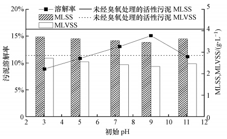 在污泥臭氧處理過程中,臭氧投加量和活性污泥的初始pH會影響污泥的溶解率及有機(jī)質(zhì)、氮、磷等物質(zhì)的溶出,從而影響污泥臭氧減量的效果.故合理的臭氧投加量和污泥初始pH不僅對污泥臭氧減量有利,而且可以提高工藝的經(jīng)濟(jì)性.