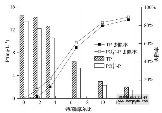 如前所述,當(dāng)生物處理系統(tǒng)剩余污泥零排放時,出水中磷濃度將逐步升高,因此,需要增加除磷工藝,使出水TP達(dá)標(biāo).圖 7初步考察了鈣磷摩爾比對除磷效果的影響.由圖可知,隨著鈣磷摩爾比的增大,上清液中的TP和PO3-4-P逐漸降低,鈣磷摩爾比在3.3~10.0時,磷去除率增加較快,在0~3.3和10.0~13.3時,去除率增加較緩.鈣磷摩爾比在10.0以上時,TP和PO3-4-P的去除率均超過80%.