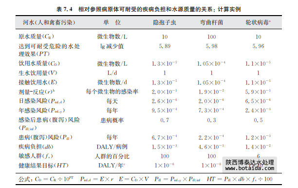 當(dāng)需將一個(gè)病例中發(fā)生特定疾病的風(fēng)險(xiǎn)轉(zhuǎn)化為疾病負(fù)擔(dān)時(shí),可以使用DALY(metric disabilityadjustedlifeyear)(見第3章3.1)。這不但反映了急性終點(diǎn)反應(yīng)(腹瀉),也反映了 死亡率和更嚴(yán)重的終點(diǎn)反應(yīng)(如與彎曲桿菌有關(guān)的格林 巴利綜合癥,即急性感染性多發(fā)神 經(jīng)炎)。每個(gè)病例的疾病負(fù)擔(dān)變化很大。例如,每1000例輪狀病毒的疾病負(fù)擔(dān)在低收入地 區(qū)為480DALYs,而且還經(jīng)常發(fā)生兒童死亡。但在大多數(shù)居民都能得到醫(yī)療救助的高收入 地區(qū)僅為14DALYs/1000例(見附錄1支持性文件《世界衛(wèi)生組織飲用水水質(zhì)準(zhǔn)則中公共 衛(wèi)生風(fēng)險(xiǎn)量化》)。由于這種疾病負(fù)擔(dān)上的明顯差別,為了要達(dá)到相同的危險(xiǎn)程度(以 DALYs/人/年表示),在相同水源質(zhì)量的情況下,在低收入地區(qū)就需要實(shí)施更嚴(yán)格的水處 理。表7.4中10-6DALY/人/年這樣的健康結(jié)果目標(biāo)最好能與具體國情相結(jié)合。表7.4中 沒有免疫缺陷人群的計(jì)算數(shù)值(如 HIV/AIDS患者中的隱孢子蟲?。?,在某些國家,這些人群的數(shù)量還是很多的。3.2節(jié)中有更多關(guān)于DALY的信息,及關(guān)于如何將其用于獲取風(fēng)險(xiǎn) 參考值。
