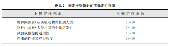 涉及一般人群的接觸劑量時(shí),以動物實(shí)驗(yàn)臨界效應(yīng)得出的犖犗犃犈犔或犅犕犇/犅犕犇犔通 常要除以不確定性系數(shù)100。這里還有兩個(gè)10倍系數(shù),其一是物種間差異,另一個(gè)是人群中 個(gè)體間差異(見表8.2)。另外的不確定性系數(shù)還可能來自數(shù)據(jù)資料的不足和有害作用的嚴(yán) 重性和不可逆性。