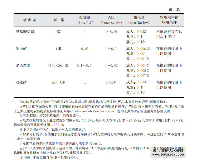 雖然沒必要為以控制攜菌體為目的的農(nóng)藥設(shè)定準(zhǔn)則值,但有必要就它們使用時(shí)的安全 性提供足夠的信息。用于飲用水?dāng)y菌體控制的農(nóng)藥劑型必須嚴(yán)格遵守商品標(biāo)簽建議,并且 包括從材料到配制最終產(chǎn)品的配方組分,一定要使用國家主管部門批準(zhǔn)可用于此用途的產(chǎn) 品。為制定準(zhǔn)則評(píng)估控制攜菌體的農(nóng)藥時(shí),評(píng)價(jià)報(bào)告主要由犃犇犐與潛在暴露風(fēng)險(xiǎn)的比較組 成。不過,超過犃犇犐的攝入不一定意味著會(huì)對(duì)健康產(chǎn)生負(fù)面影響。由于攜菌體傳播的疾病 有很高的發(fā)病率和死亡率,控制病原昆蟲與飲用水?dāng)z入農(nóng)藥量之間必須找到一個(gè)合適的平 衡。需要強(qiáng)調(diào)的是,應(yīng)努力使總攝入量和任何殺幼蟲劑的濃度都低于 WHOPES的推薦水 平,并且在具有足夠的效力條件下盡可能低。