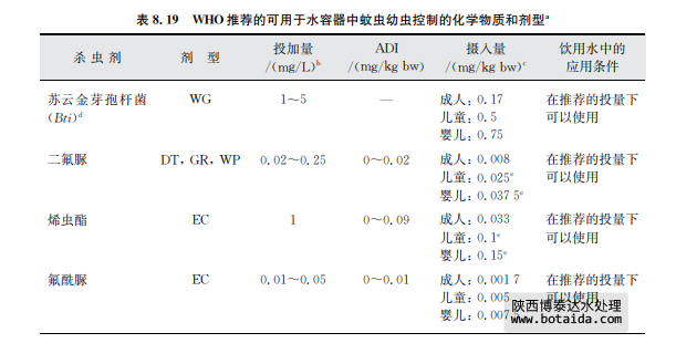 WHOPES對(duì)因公共衛(wèi)生目的使用的農(nóng)藥進(jìn)行了評(píng)價(jià)。目前,WHOPES已評(píng)估并列出的 可在容器中控制蚊蟲幼卵的包括七種殺幼蟲劑(二氟脲、烯蟲酯、氟酰脲、甲基嘧啶磷、吡丙醚、 多殺菌素和雙硫磷)和一種細(xì)菌殺蟲劑(蘇云金芽孢桿菌,犅犪犮犻犾犾狌狊狋犺狌狉犻狀犵犻犲狀狊犻狊犻狊狉犪犲犾犲狀狊犻狊)。