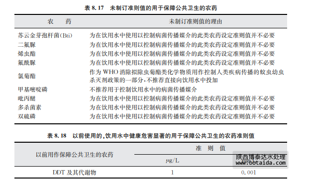表8.17列舉了尚未制訂準(zhǔn)則值用于保障公共衛(wèi)生的農(nóng)藥。二氯二苯基三氯乙烷 (DDT)在過去常被使用以保障公共衛(wèi)生,現(xiàn)在在某些地區(qū)將DDT再次引入以控制攜帶瘧疾 的蚊蟲(但不應(yīng)用在飲用水領(lǐng)域)。表8.18列出了DDT的準(zhǔn)則值。表8.19列舉了各種殺 蟲劑產(chǎn)品的劑型,投量比和相應(yīng)的攝入量。 準(zhǔn)則中所涉及的殺幼蟲劑的資料概覽詳見第12章