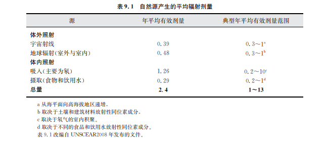 據聯(lián)合國輻射效應科學委員會估計(UNSCEAR,2008),全球每人接受來自環(huán)境中所有 放射源的年平均劑量約為3.0mSv/年(物理量解釋見專欄9.1)。其中,80%(2.4mSv)來自 自然源,19.6%(接近0.6mSv)來自醫(yī)療診斷輻射,而剩下的0.4%(約0.01mSv)來自于其 他人工源(見圖9.1)。對于整個人群,每個人所接受的輻射劑量變化很大,取決于居住地點、 飲食規(guī)律和生活方式等因素。個人輻射劑量也可能因醫(yī)療暴露和職業(yè)暴露而不同。表9.1 列出了年平均劑量和天然來源個人輻照劑量的典型范圍(UNSCEAR,2008)。
