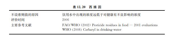 西維因通過抑制腦膽堿酯酶活性發(fā)揮作用,這也是其主要的毒性模式。不過,西維因也 被認為是一種小鼠體內會引起雄性小鼠血管瘤的非基因毒性致癌物。在此基礎上,JMPR 設定犃犇犐為0~0.008mg/kgbw,這一犃犇犐通過15mg/kgbw/d的最低損害作用水平 (LOAEL)以及采用安全系數(shù)為2000(種間變異為10,種內變異為10,不確定系數(shù)另取10 用來反映罕見惡性腫瘤的出現(xiàn))計算而得。 假定一個60kg的成年人每天飲用2L水,飲用水的攝入配額假設為20%,從0~ 0.008mg/kgbw的犃犇犐值可以確定以健康為基準的準則值為50μg/L(取整值)。不過,似 乎在飲用水中沒有發(fā)現(xiàn)高濃度西維因,因此認為沒有必要提出一個正式的準則值。