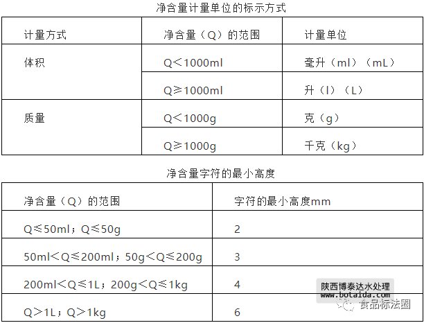 凈含量應(yīng)依據(jù)法定計量單位標注,分別質(zhì)量單位[克(g)、千克(kg)]和體積單位[升(l)(L)、毫升(ml)(mL)]。固態(tài)食品只能標示質(zhì)量單位,液態(tài)、半固態(tài)黏性食品可以選擇標示體積單位或質(zhì)量單位。