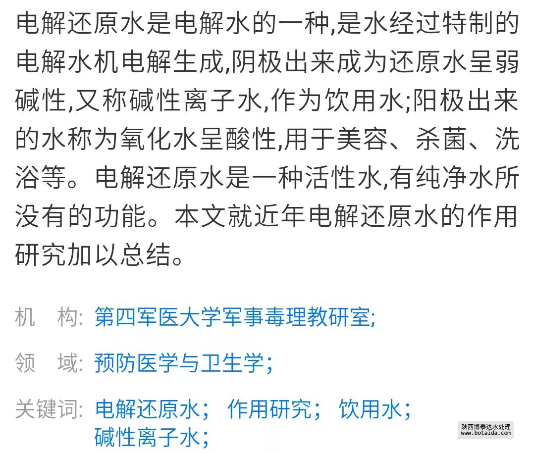 通常情況下,電解還原水是由普通的自來(lái)凈化水,然后通過(guò)陰陽(yáng)電極,在電場(chǎng)的作用下將水分子團(tuán)打散、變小、重新排列,使水分子的結(jié)構(gòu)發(fā)生改變,使其中一部分水的氧化還原電位呈正值,另一部分水的氧化還原電位呈負(fù)值,最后通過(guò)膜分離技術(shù)得到電解還原水,使之具有醫(yī)療保健作用.