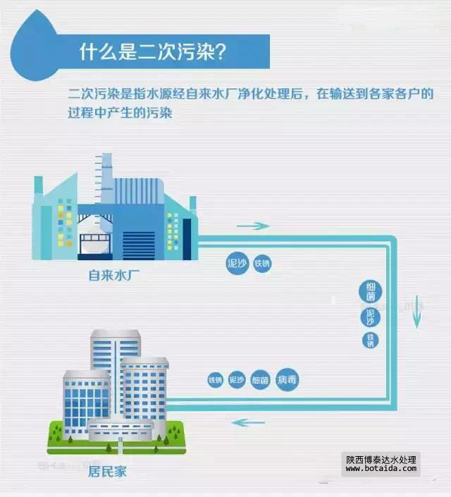 顧名思義,二次污染是指水源經(jīng)自來水廠凈化處理后,在輸送到各家各戶的過程中產(chǎn)生的污染。主要是一些水管老化出現(xiàn)的鐵銹、泥沙、細菌、病毒等雜質(zhì)和自來水廠氯制劑消毒后的副產(chǎn)物。二次污染的污染源主要有自來水管道、小區(qū)二次供水系統(tǒng)和水龍頭。